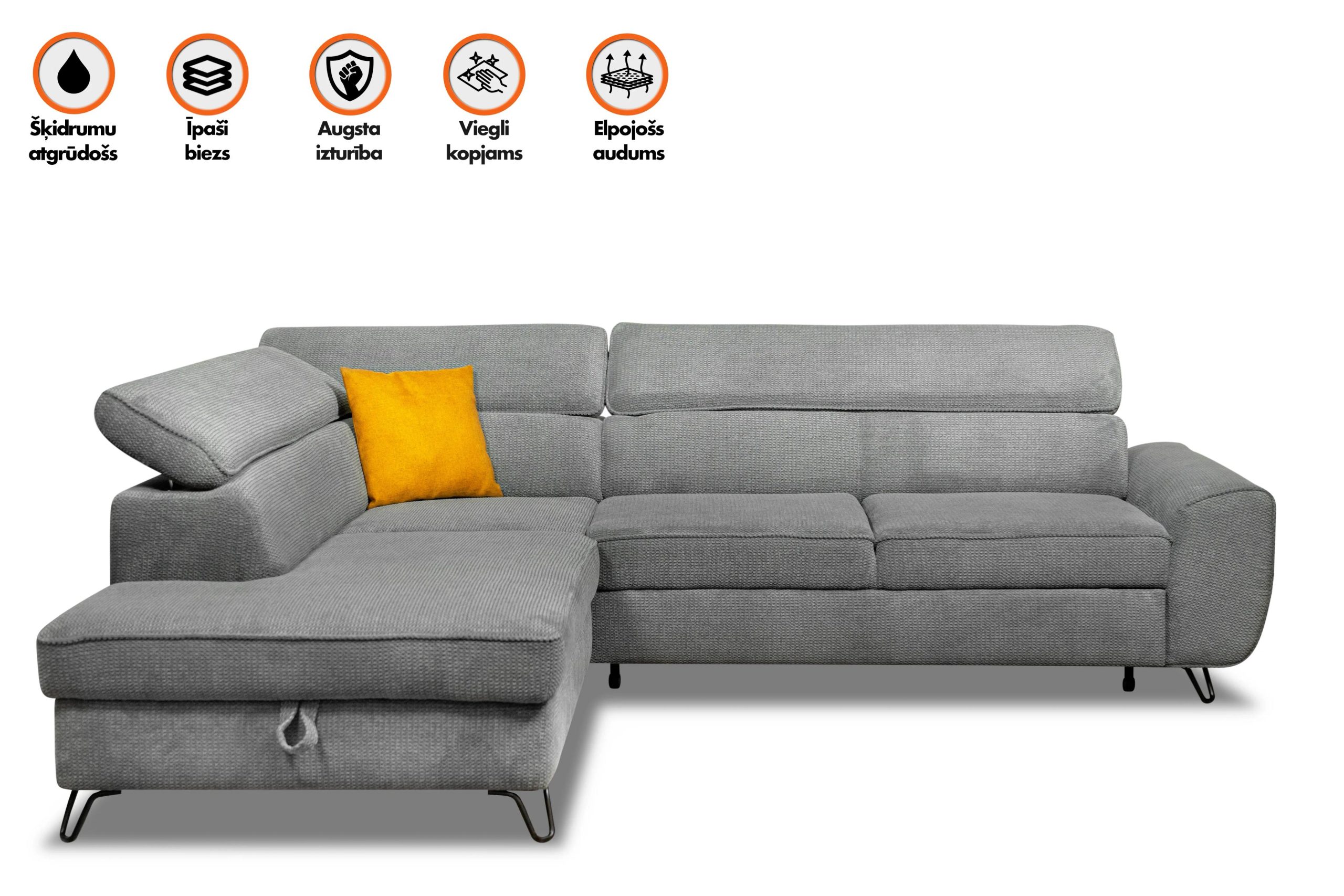 - Ekskluzīvs premium klases buklē audums ar iestrādātu “SMART” tehnoloģiju – apvieno greznu izskatu ar ikdienas funkcionalitāti.